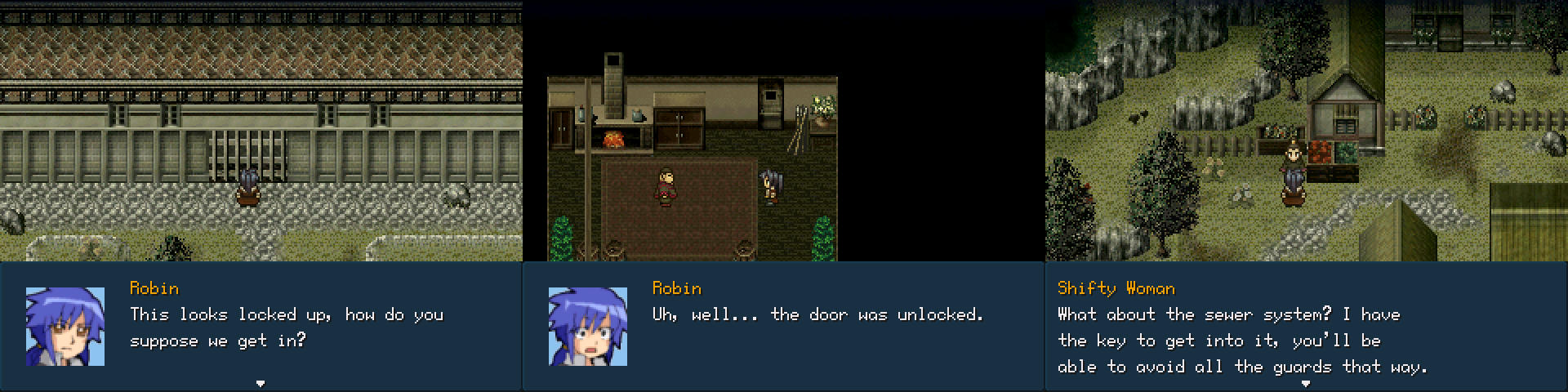Let's take the above screenshots for example — at first I intended for there to be an underlying trust value between the townspeople and the party, one largely impacted by how you chose to access the town at the start of the arc. If you went in the main gate, nothing that special would really happen. If you snuck in, the townspeople would be more wary of you when you start kicking up a fuss.