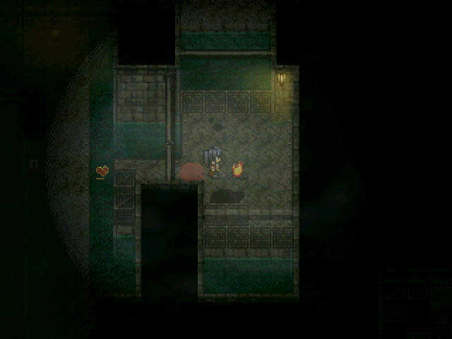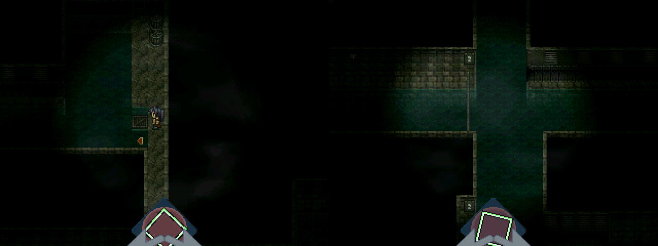 As you can see above, the sewer itself doesn't exactly appear spacious. The pathways are only one tile wide. Originally this was intentional, I wanted to try and avoid creating an Absurdly Spacious Sewer. The problem with this is it meant I couldn't use my usual visible-on-map event-based enemy encounters, because there would be no way to avoid an enemy in your path.