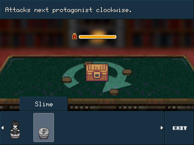 So I created a random encounter system! That's the indicator at the bottom of the screen. Depending on how you interacted with the dungeon, the indicator would slowly spin faster until an encounter was triggered. Walking near water made it go up faster, and closing doors behind you would kick the counter down several points. It fits nicely within the world-building, showing that the sewer puzzles themselves inhibit the monsters.