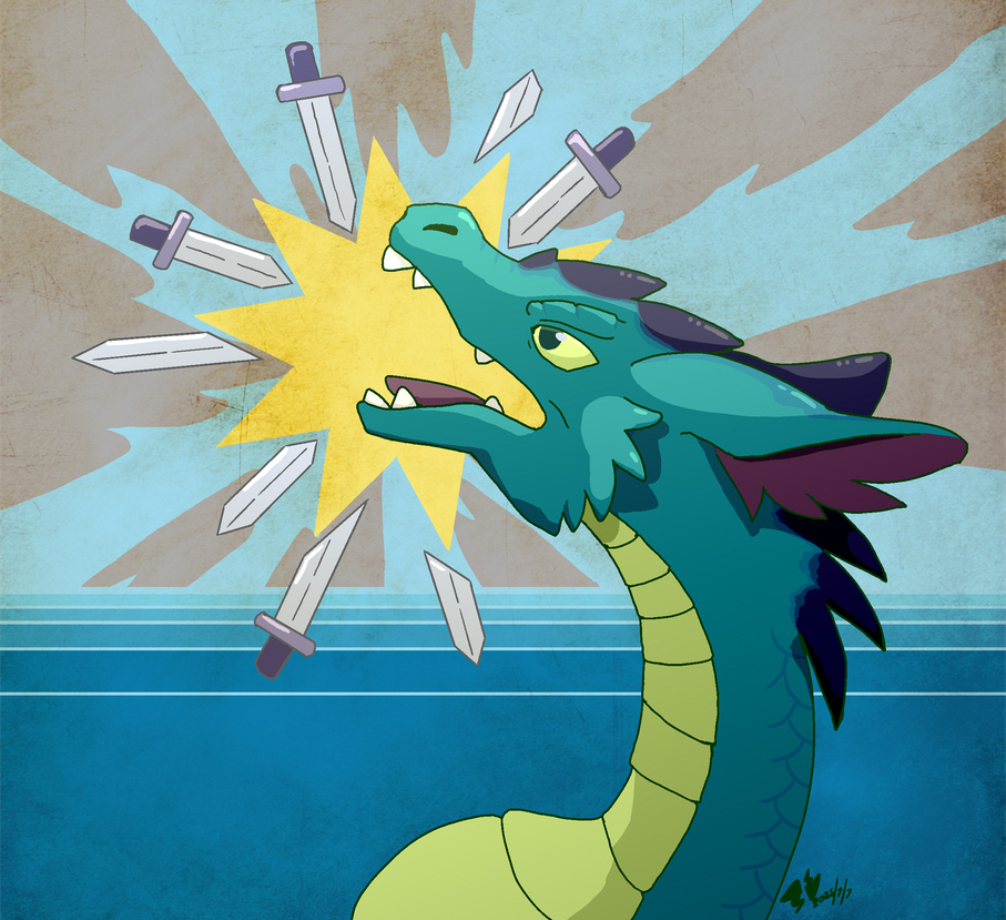 The first piece done for this year's Art Fight. I wanted to play some with the apparent theme of swords Cyaneus has with their dragon self, as it always made me think of the Swords suit from tarot. I considered the idea of victory over a conflict, though I'm not strictly sure if that's what the Five of Swords actually means~.