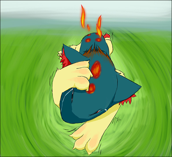 Quilava Transformation art, in case it wasn't obvious. Also foreshortening practice.