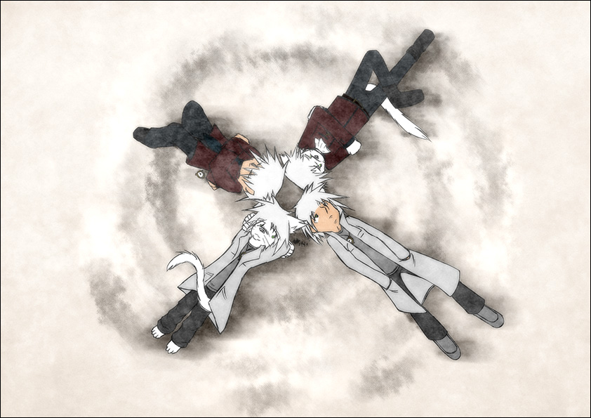 I then started developing Lucien and Kiyba's backstory through IRC roleplay plots. At the time at least, Kiyba had some kind of power over space-time - thus the pocket-watch motif - and accidentally created a localised divergence in the timeline. This created a timeline where he was Kiyba, and a timeline where he was Lucien, somehow.