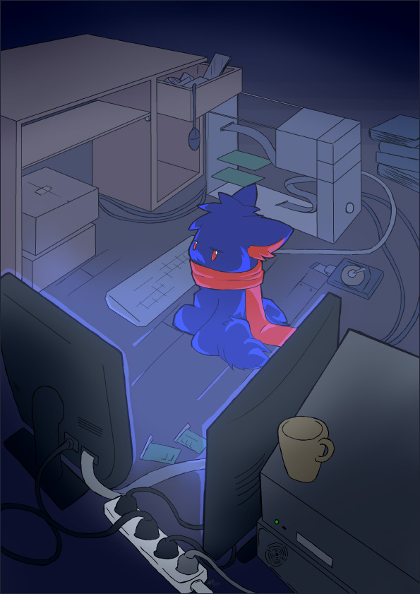 I really quite like this. The perspective turned out great, and I think I managed to capture Morroque's fluffy look without making him look entirely different as I have inadvertently in the past. The lighting was a bit of an experiment. Originally there was a lot of brown and greys from the wood of the furniture and the room, but it lacked the feel I was trying to convey. I layered over a basic blue and made foreground objects less toned and it turned out nicely.
